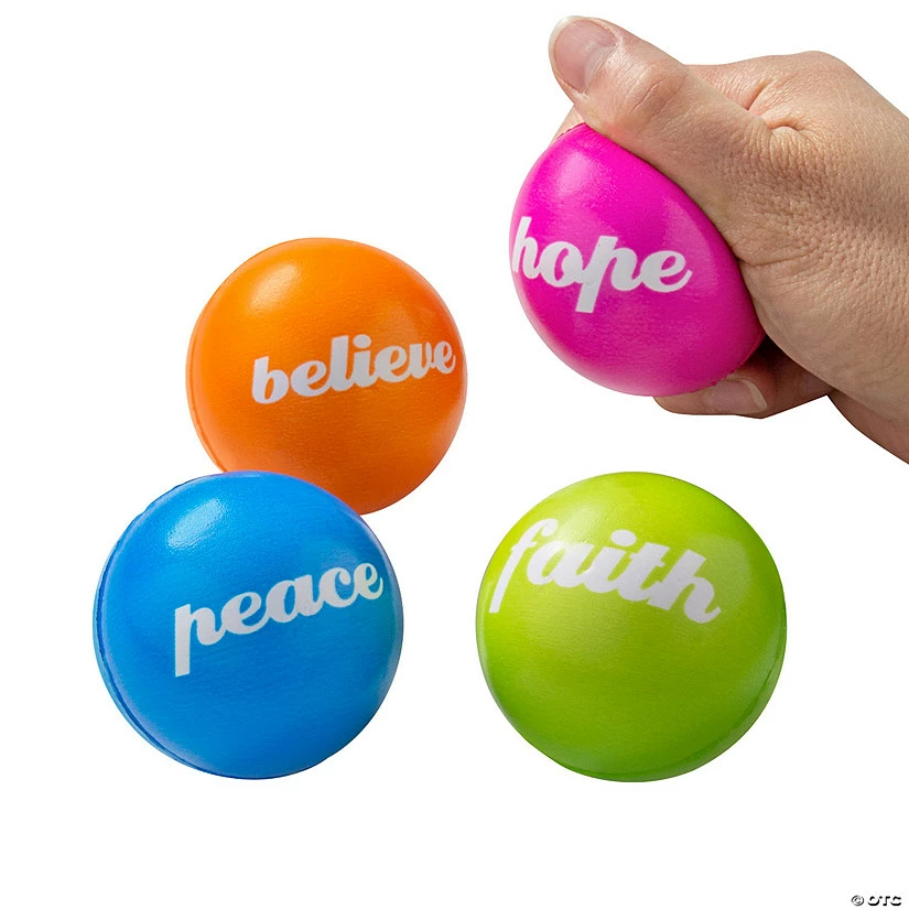 β’ What’s Included: This set includes 12 stress balls with an inspirational message on each. β’ Colorful Assortment: These stress balls are made of slow release foam and come in assorted bright colors. Each has an inspirational message like hope, believe, peace or faith. β’ Great for Kids: Not just for kids, everyone will be happy to relieve tension and get inspiration from these stress balls. β’ Home & Travel: Take these slow release foam balls wherever you need them. Stash them in your desk at work, locker at school or your backpack for when you’re on-the-go. Product Description: Get a big squeeze of support with these inspiration stress balls. Bright, cheerful colors, inspirational messages and soft, squeezable foam make these balls a must-have at school or work. They make thoughtful gifts for a Bible study group, VBS or Sunday school because they make great fidget toys to keep hands busy. Specs: Size: 2 1/2β Quantity: 12Material: FoamBrand: Β© OTC – Oriental Trading Company